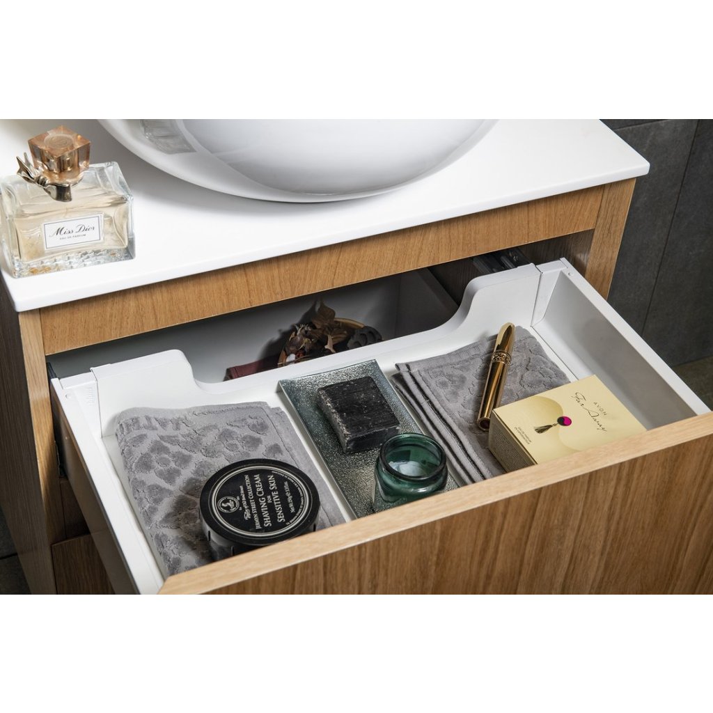 A tökéletesen diszkrét FILENA fürdőszobabútor sorozat tölgy furnérból készült szekrényeket kínál átlátszó lakkal kezelt fa dekor természetes változatában és fehér matt lakkozásban.