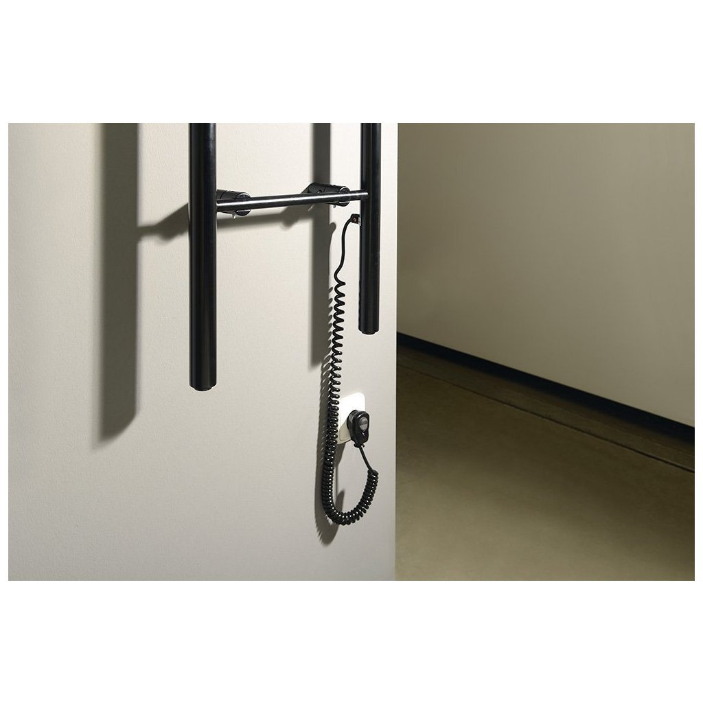 Elektromos törölközőszárító a modern belső térben - matt fekete színben nem csak csövek és tartók találhatók, hanem tápkábel és elektromos csatlakozó is.