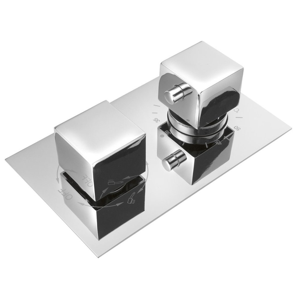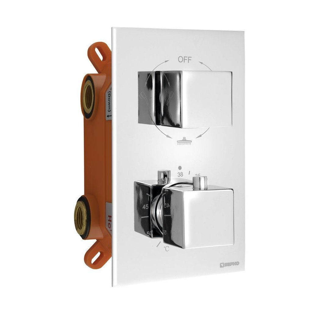 A termosztatikus csaptelep gyárilag 38 °C-os vízhőmérsékletre van beállítva. A víz kiengedése után az alsó fogantyú tüske nélküli jobbra forgatásával 38 °C-os víz fog folyni. Ha vízhűtőt szeretne, csak fordítsa el az alsó fogantyút jobbra. Ha melegebb vizet szeretne, nyomja meg az alsó fogantyún lévő biztonsági reteszt, majd fordítsa el balra. A víz áramlását alsó fogantyúval szabályozod, csap nélkül. Hogy a víz folyik-e pl. A kézi vagy fejzuhany közül a kapcsoló felső fogantyújával választhat.
