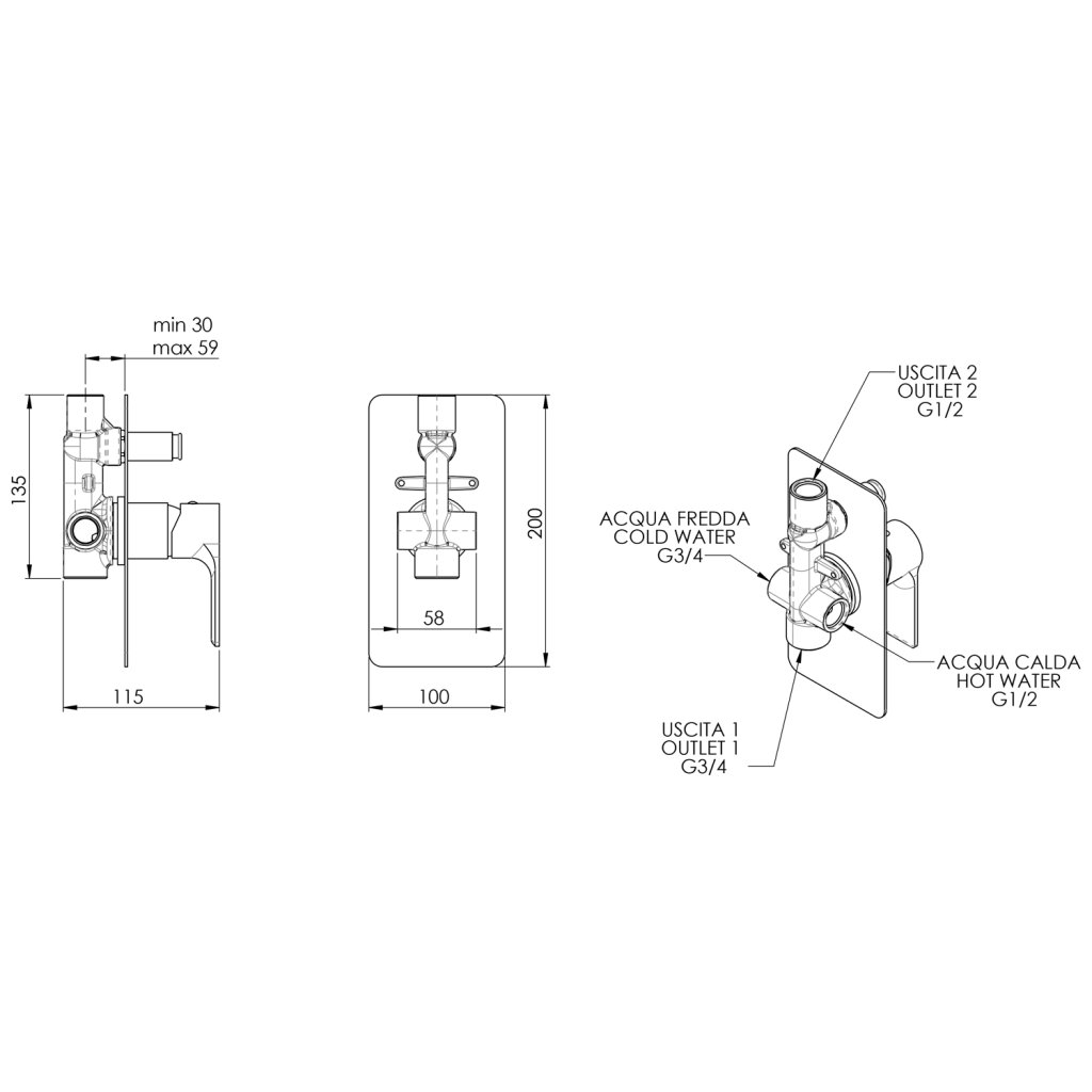 Rejtett karos zuhanycsaptelep, integrált kapcsolóval 2 kimenethez, króm