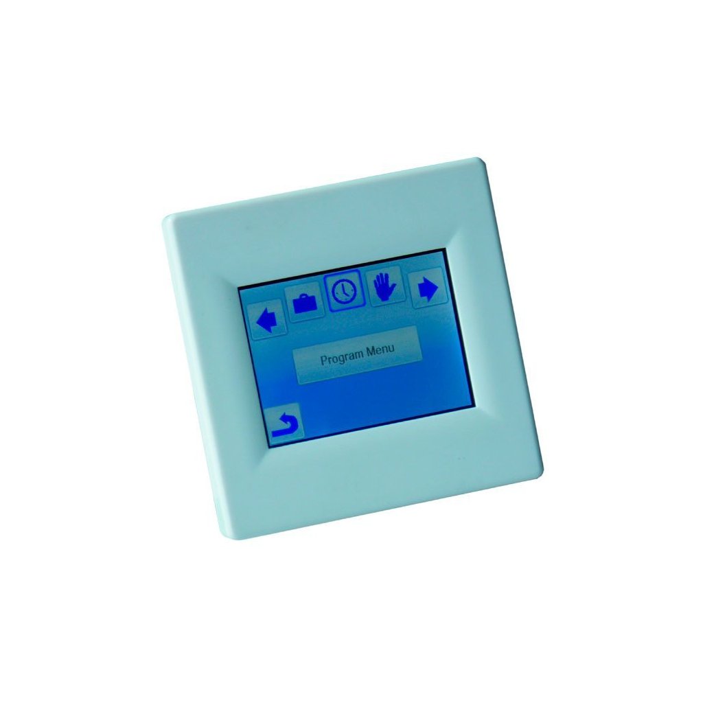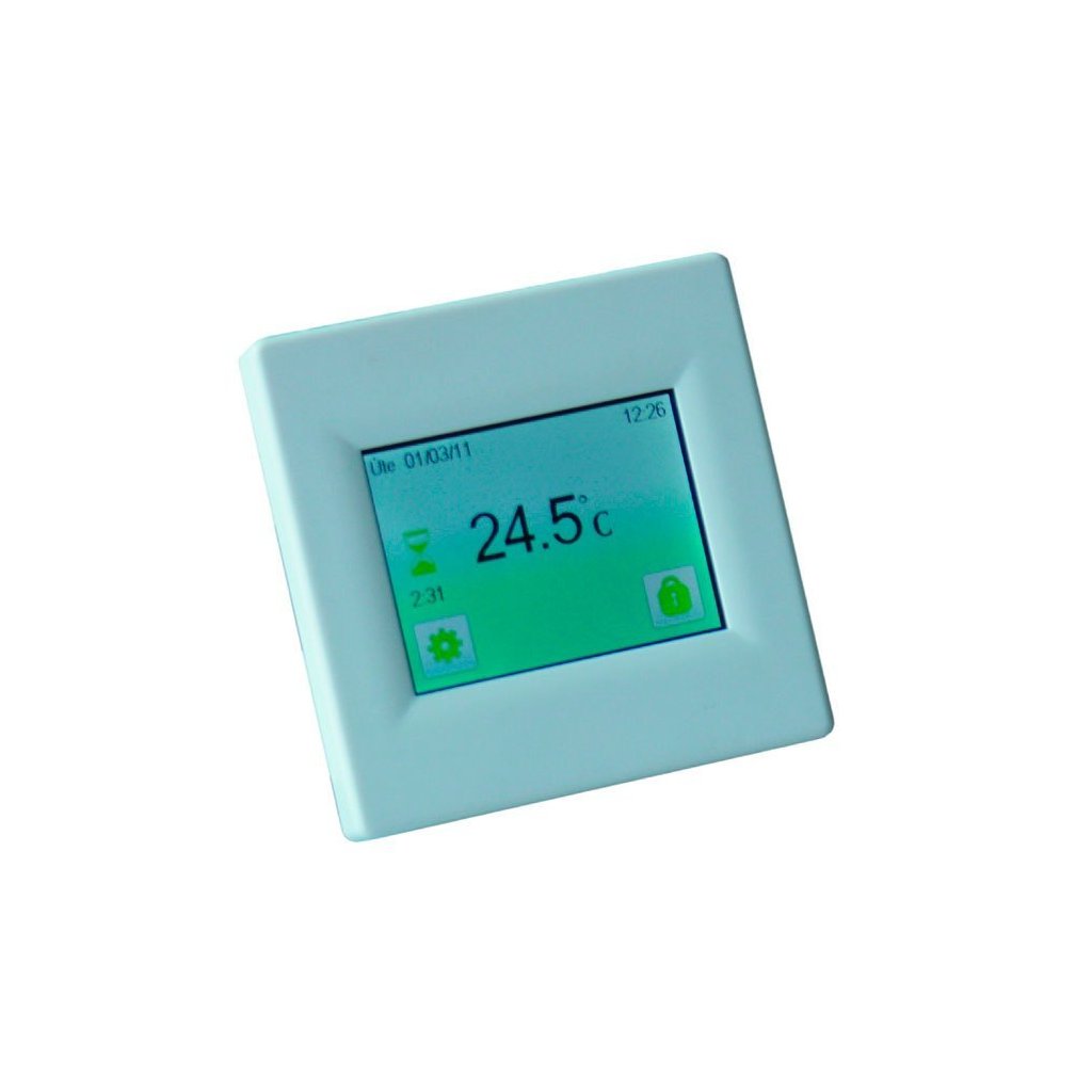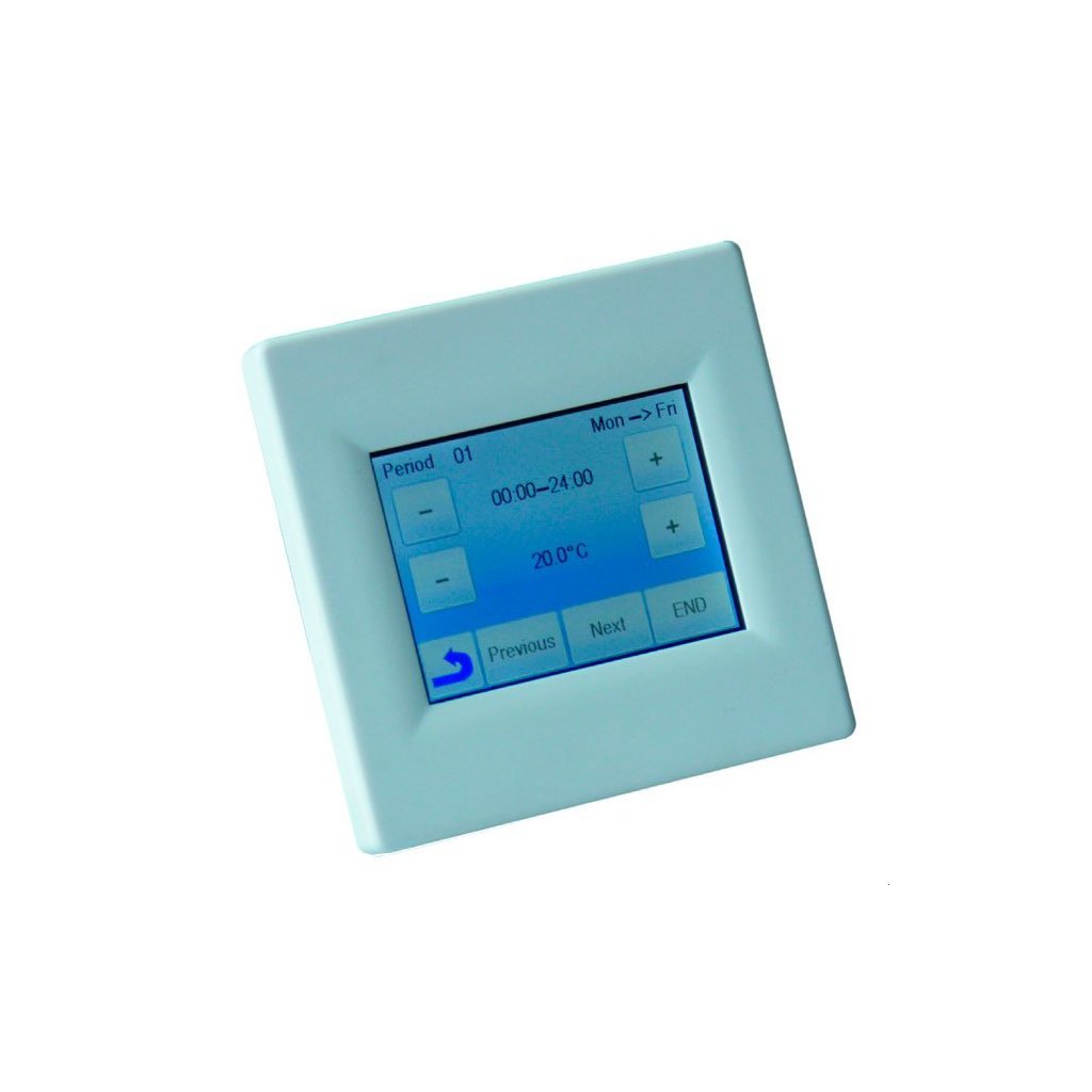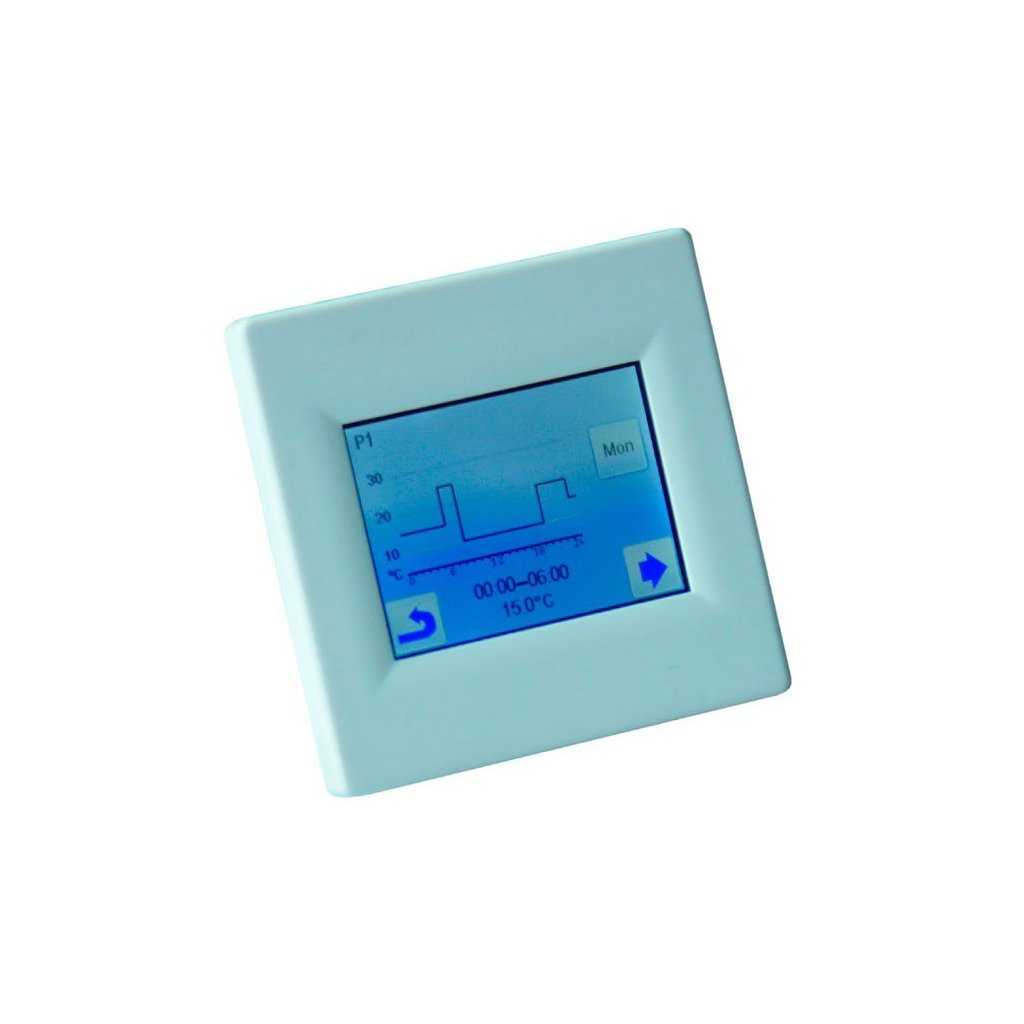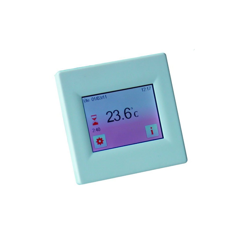 Programozható univerzális termosztát - érzékeli a helyiség és a padló hőmérsékletét Érintős (zárható) kijelző választható háttérszínnel, CZ menü, mért hőmérsékletek kiválasztása: "padló / tér / padló + tér / 2x padló + tér"; állítható szabályozási típus: fix hőmérséklet-különbség vagy PWM (impulzusszélesség-moduláció); működési költségek számítása (nap / hónap / év); szoba- és padlóhőmérséklet kijelzése.
