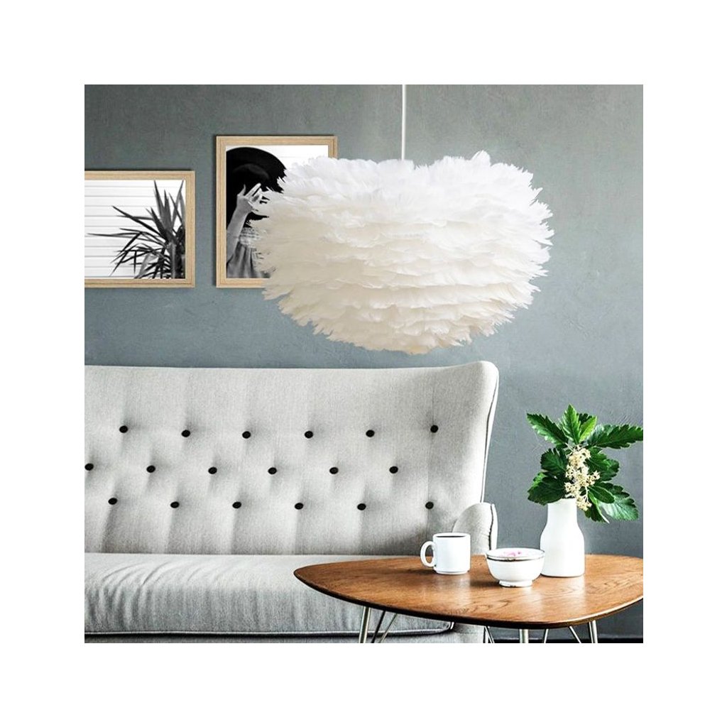 A lámpa kézzel ragasztott natúr tollakból és fém keretből készült.