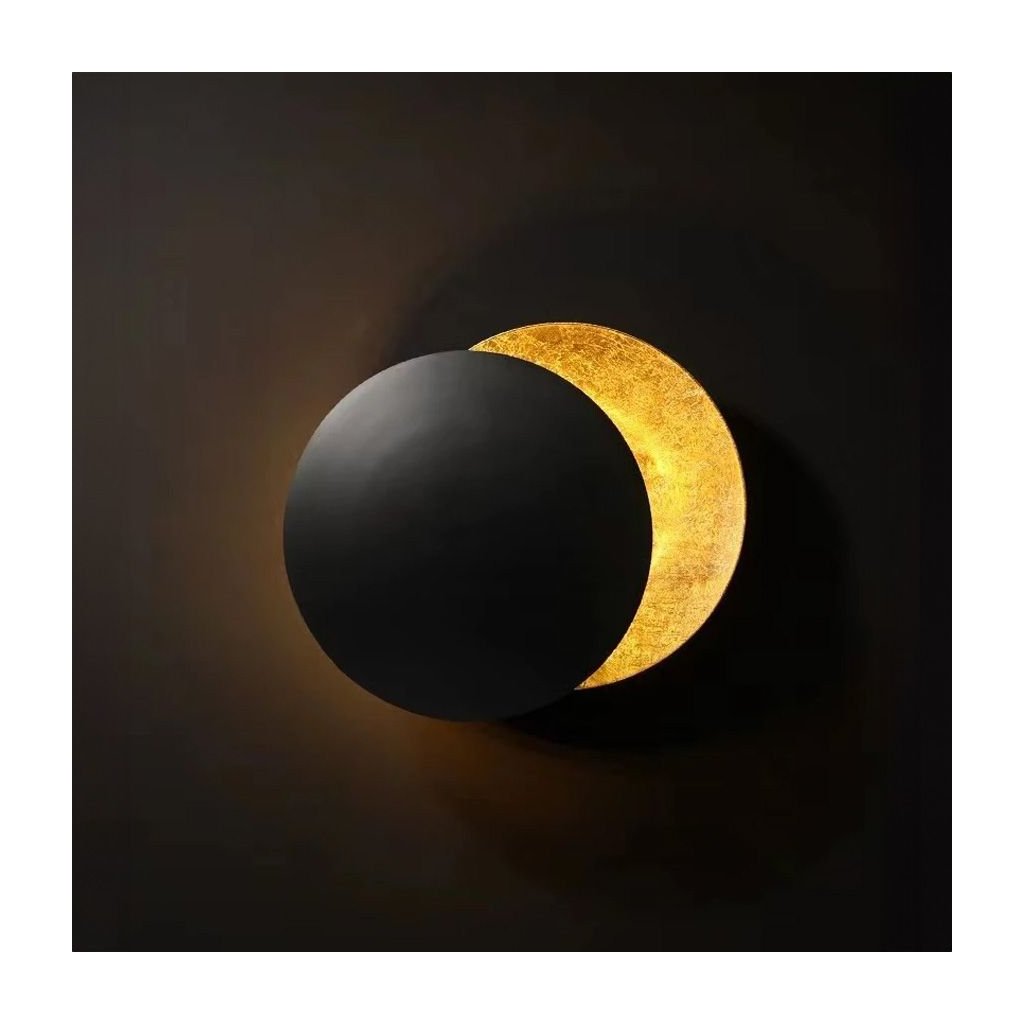 ⚜️ A falikar a modern dizájn egyedülálló példája, amely tökéletesen ötvözi a funkcionalitást az esztétikával. A lámpa két tárcsából áll - a külső felülete klasszikus mattfekete, míg a belső felülete aranyszínű fémes felülettel rendelkezik, amely átlátszó textúrával melegséget és eleganciát ad.
