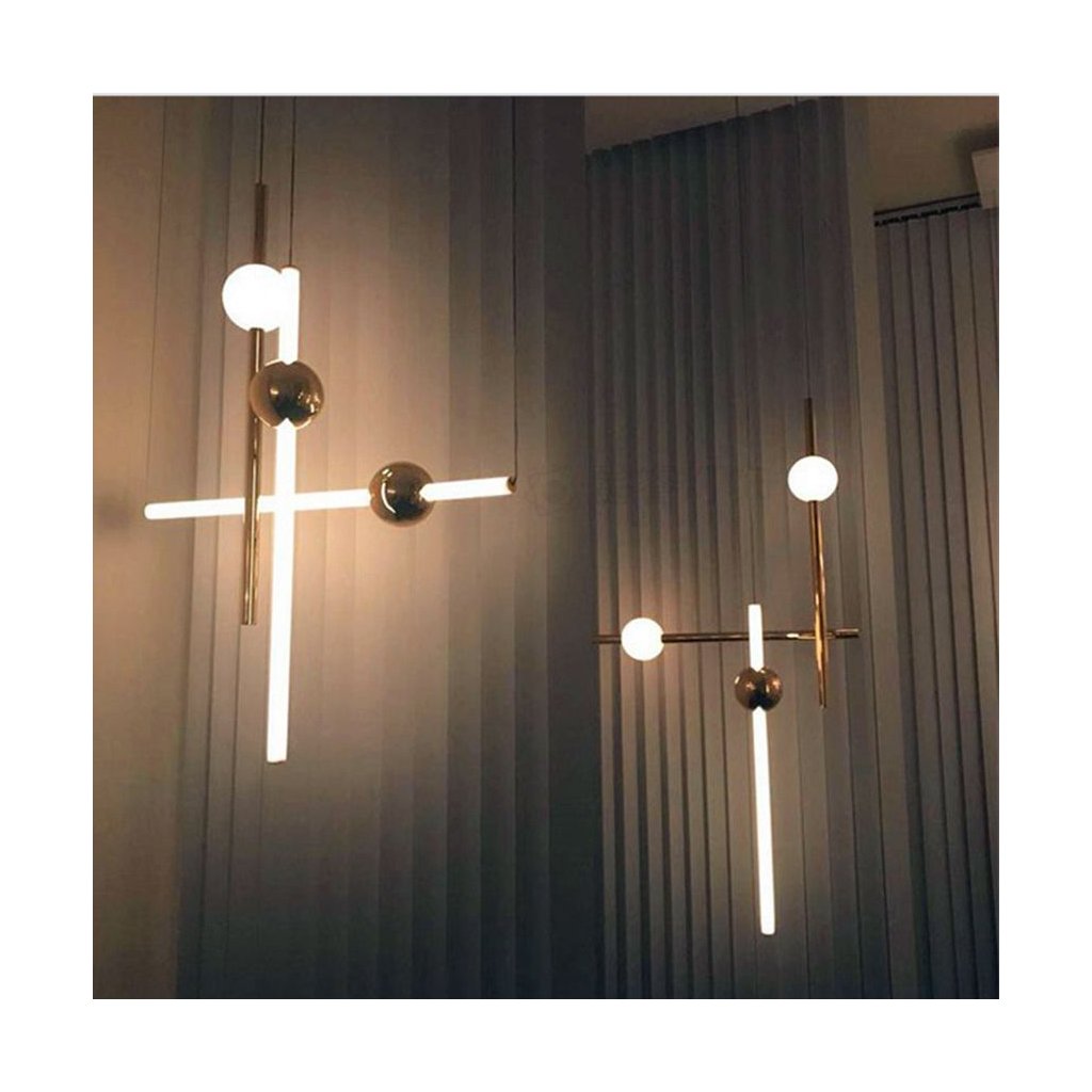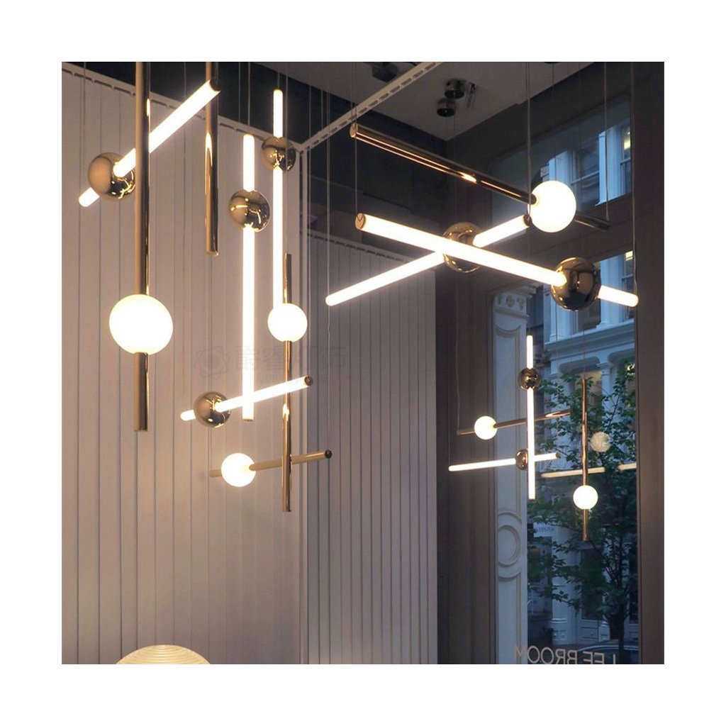 Hosszú, tetőtéri lámpa nem hajlik meg a fehér fal vagy mennyezet hátterében, és a szabadon függő rúd szokatlan szerkezete könnyedséget és teret ad körülötte.