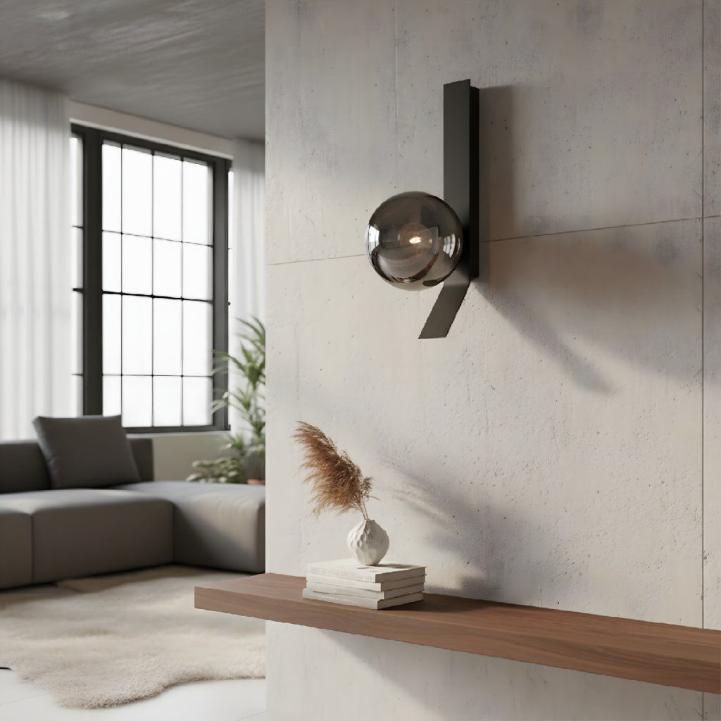 A fali lámpa minimalista fekete vonalakat ötvöz egy fényes, füstös króm árnyalatú gömbbel. A geometrikus forma rendezetté teszi a falat, a félig átlátszó lámpaernyő pedig hangulatos ragyogást teremt, amely eleganciát és mélységet kölcsönöz a belső térnek.