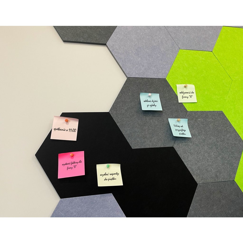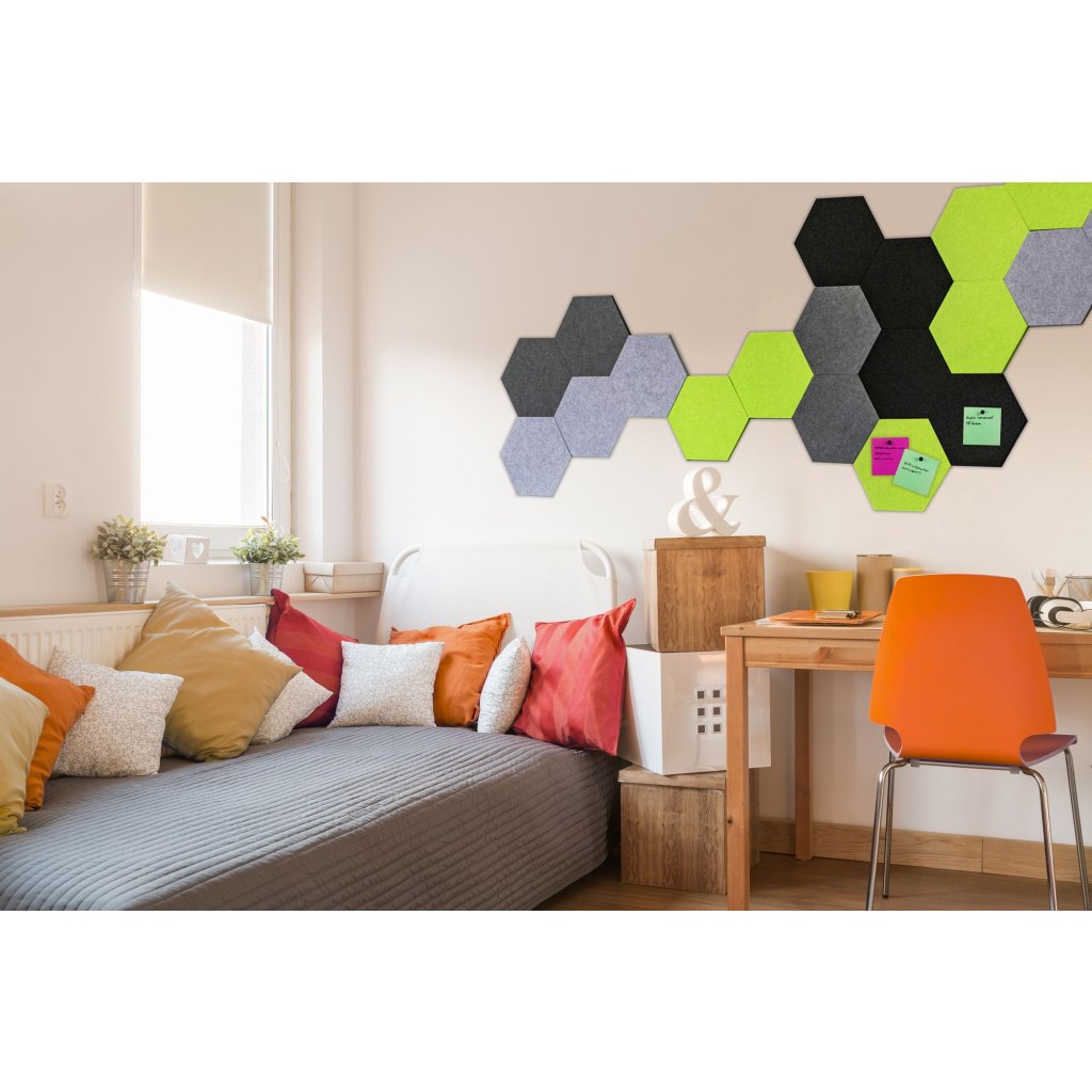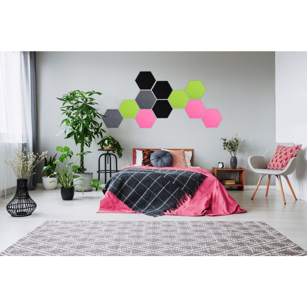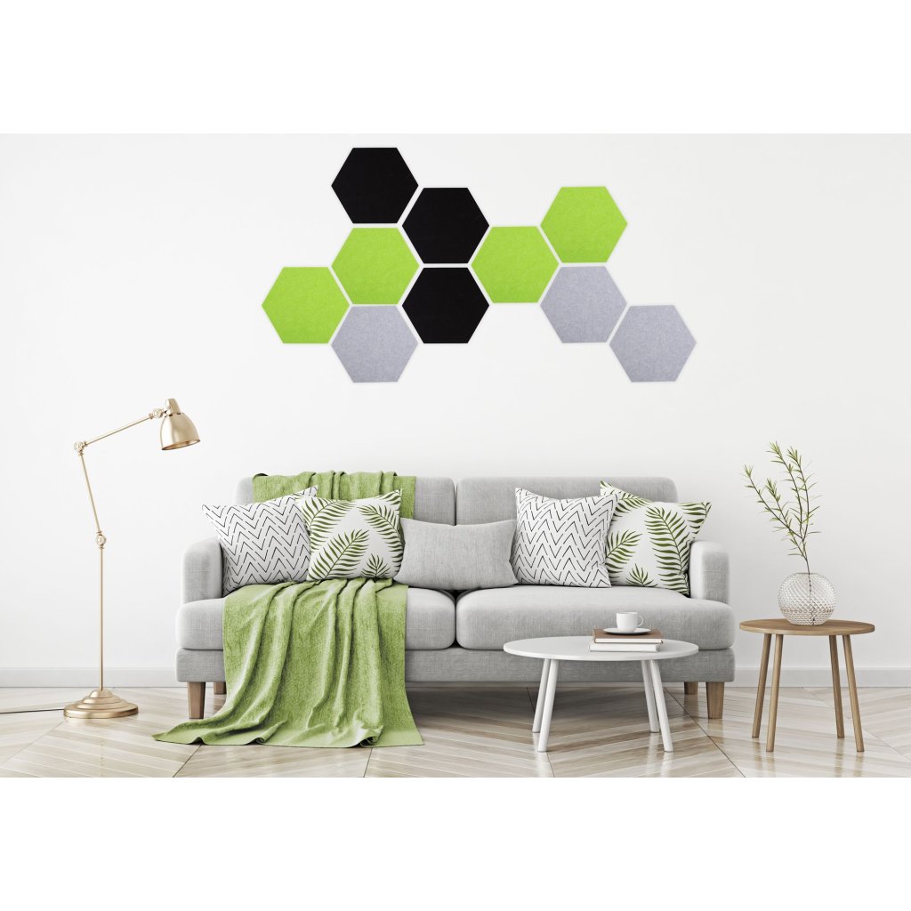A hatszögletű falpanelek remek dekorációt jelentenek minden belső térben, egy egyszerű, de hatékony dekoráció minden bizonnyal felkelti vendégei figyelmét és esztétikusan kitölti a teret. A különböző színváltozatok kombinációja esztétikus egészet hoz létre, és varázslatot ad a belső térnek. A hatszögletű panelek felszerelése gyerekjáték a másik oldalon lévő öntapadó bevonattal. A panelek másik funkciója a hangok elnémítása a helyiségben.