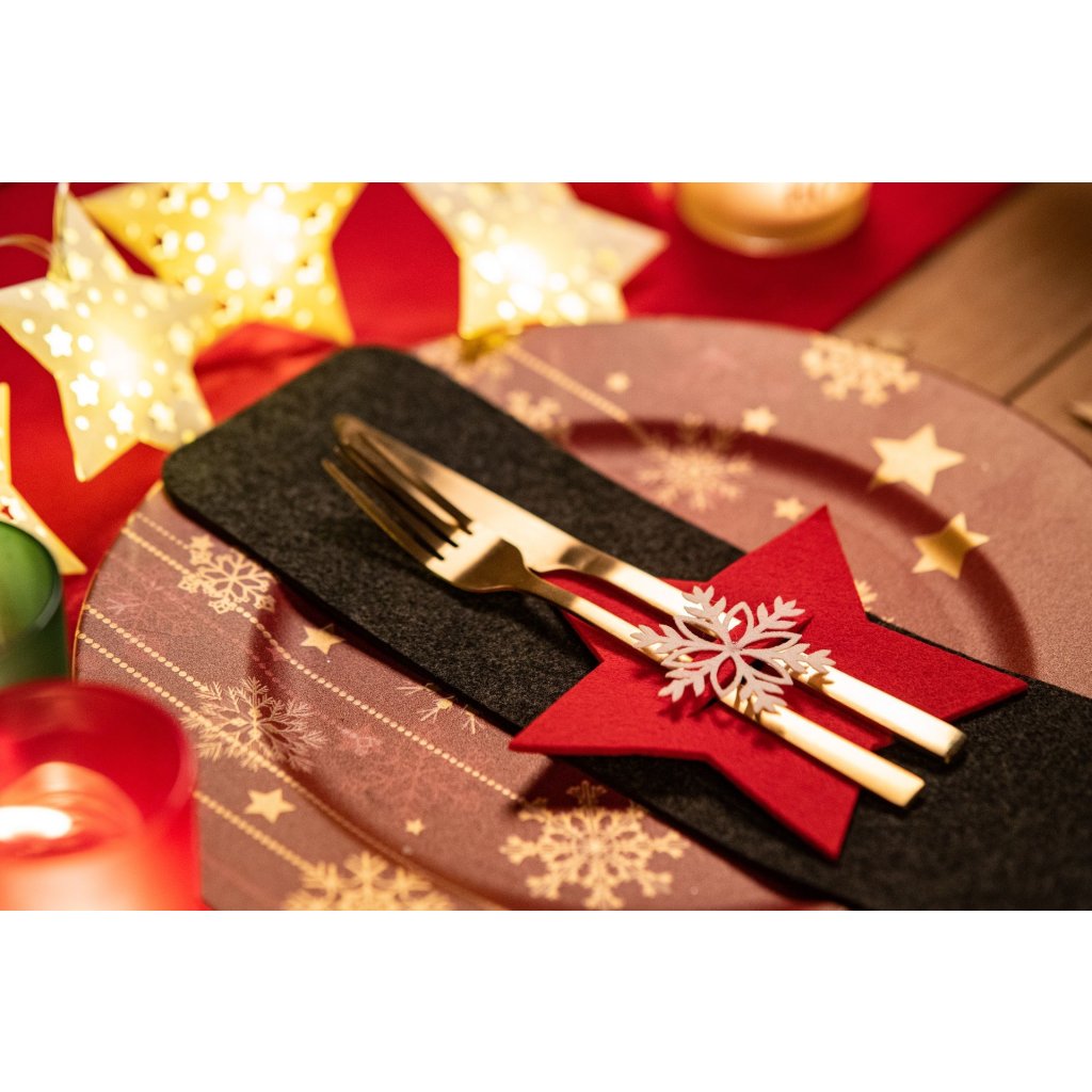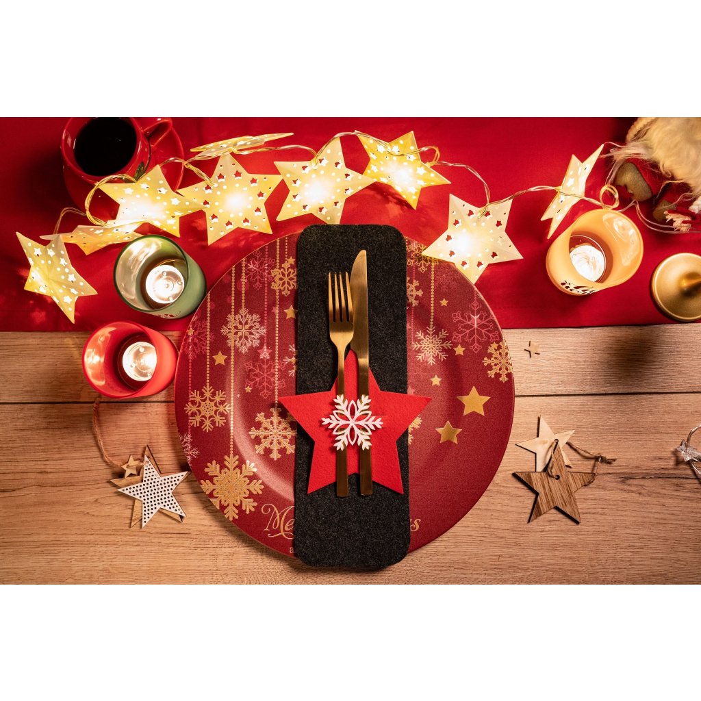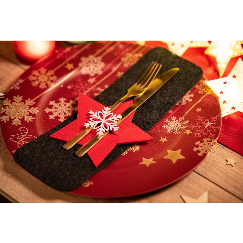 Gyönyörű piros evőeszközhuzatok csillag motívummal. Egyedülálló simítása lesz a karácsonyi asztalnak.A dekoratív csomagolást gondosan megterveztük és úgy készítettük, hogy az év legszebb időszakában tetszetős legyen a szemnek.