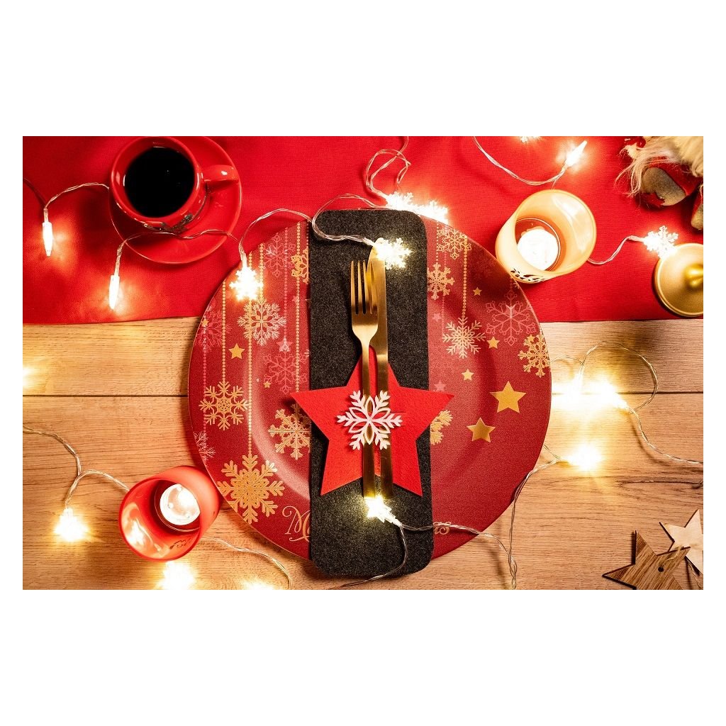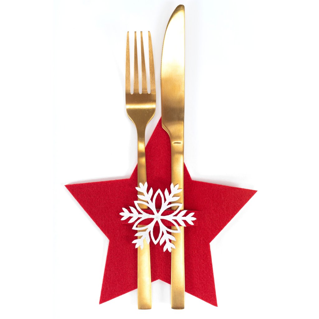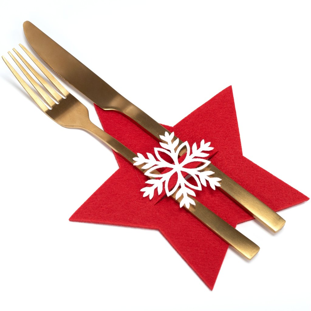 Gyönyörű piros evőeszközhuzatok csillag motívummal. Egyedülálló befejezése lesz a karácsonyi vacsoraasztalnak.A dekoratív csomagolást gondosan megtervezték és úgy készítették el, hogy az év legszebb időszakában tetszetős legyen a szemnek.
