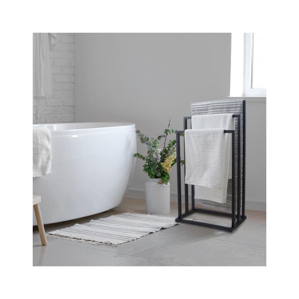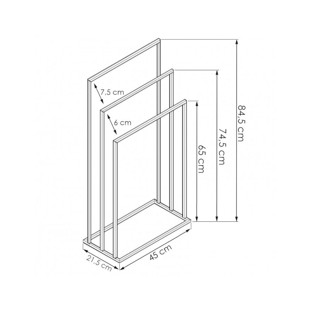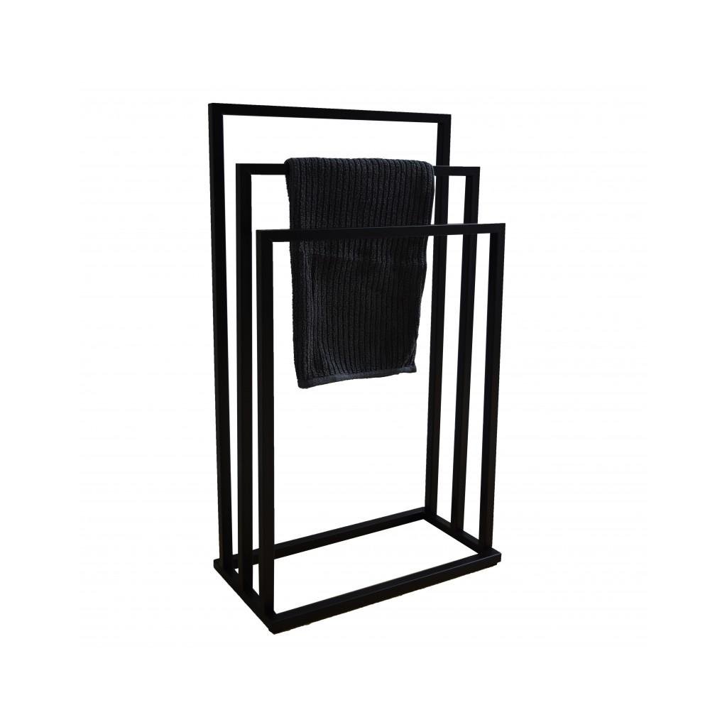 Wolnostojący wieszak na tułkówki łazienkowe. Wykonany ze stali malowanej proszkowo na kolor czarny. A törülközőtartó trzy szerokie karokkal rendelkezik különböző magasságokban. Konstrukcja ramowa zapewnia słowie sprześnia między wiszącymi tułkami, co przyspiesza ich suszenie. Lekki, ale stabilny stelaż umządząd oszły przenoszenie stajak w dogodne miejsce. Kiváló felszereltség minden fürdőszobába. Ideális esetben modern, ipari vagy loft stílusú belső térbe illeszkedik.